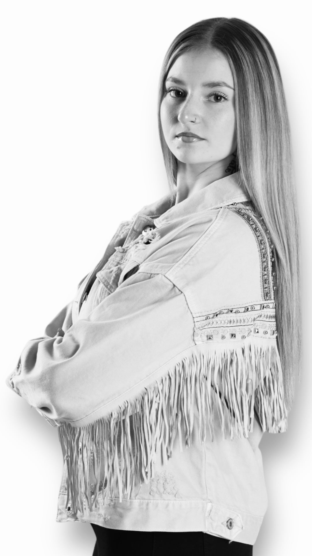 Stylische Jeansjacke, mit schöner Stickerei, Fransen und Nieten. Eine modische Ergänzung für jeden Look!