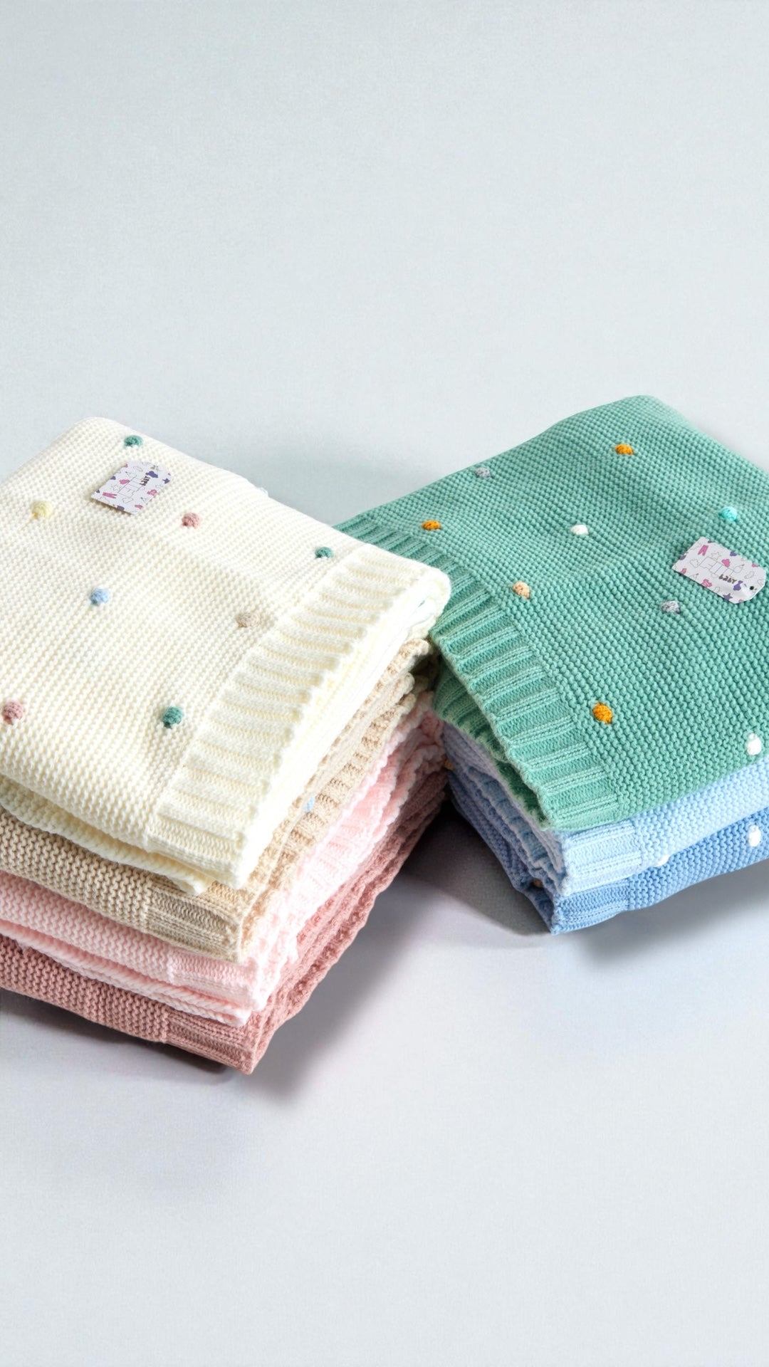 Diese liebevoll gestrickte Babydecke ist nicht nur ein kuscheliger Begleiter, sondern auch ein stilvolles Accessoire für dein Baby. Die zarten Farbakzente in Form kleiner bunter Punkte sorgen für eine verspielte Optik, während das strukturierte Strickmuster für eine angenehme Haptik sorgt.